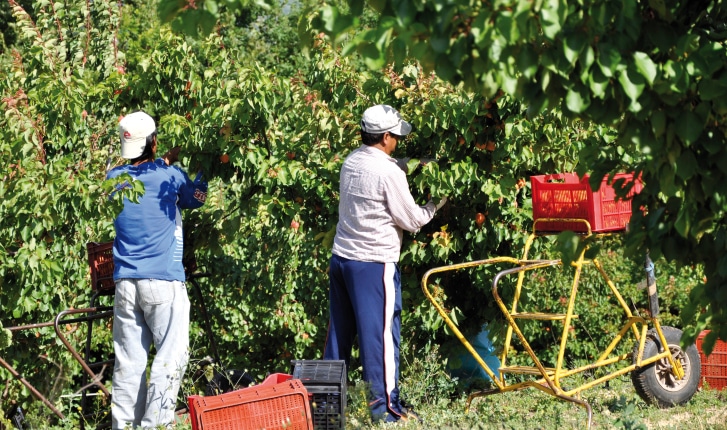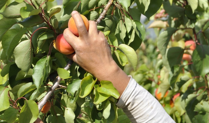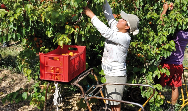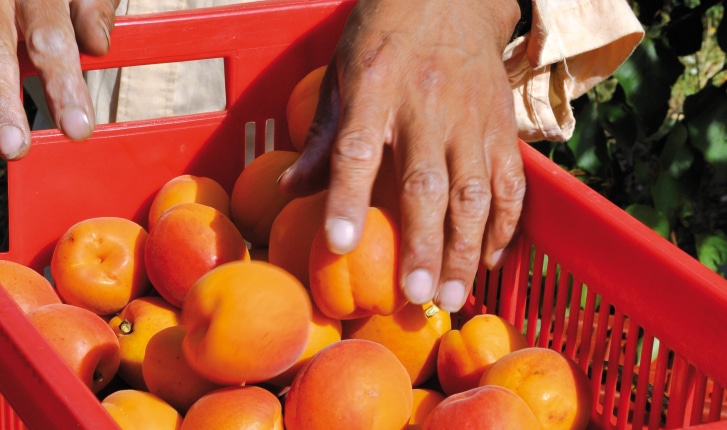 Verger d'abricotiers - détail caisse d'abricots en cours de récolte.