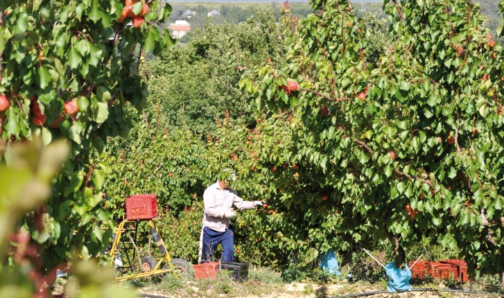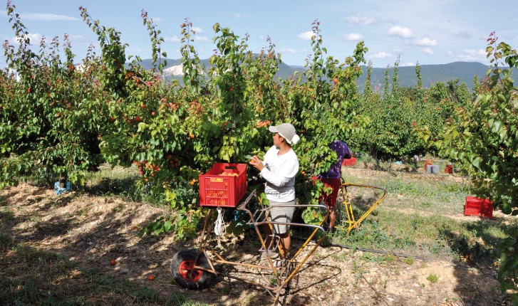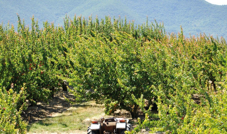 Verger d'abricotiers - paysage drômois avec tracteur.