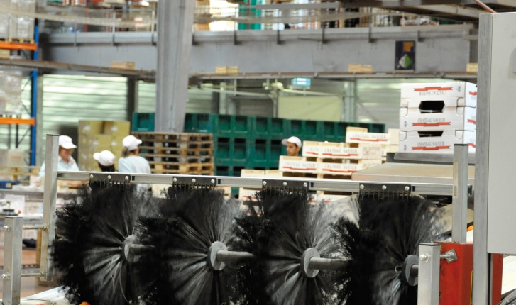 Ligne de nettoyage des abricots. Les abricots sont acheminés vers les brosses pour leur nettoyage.