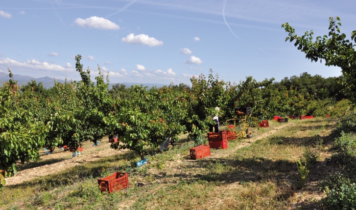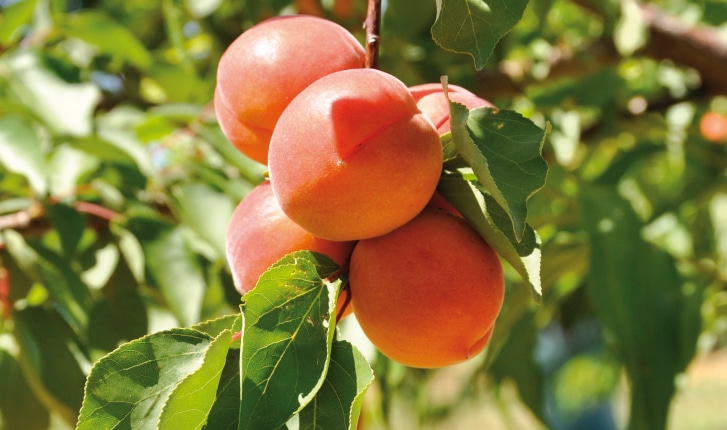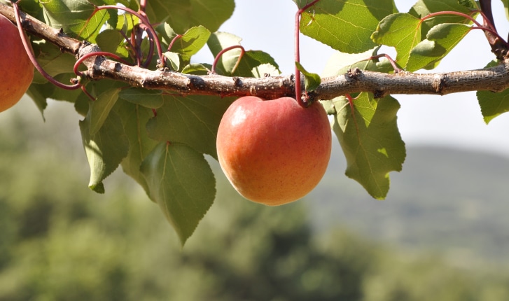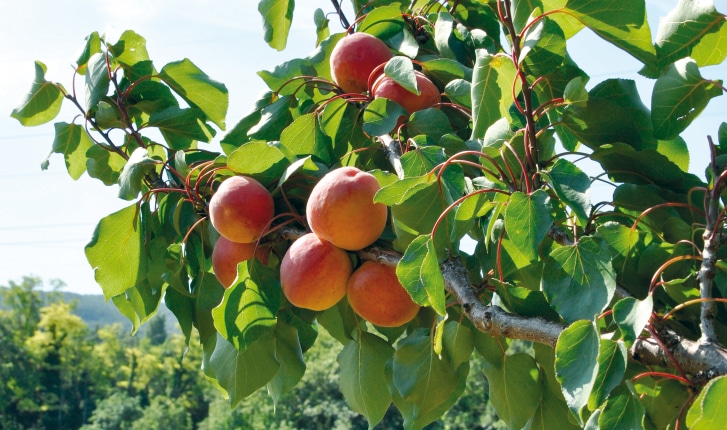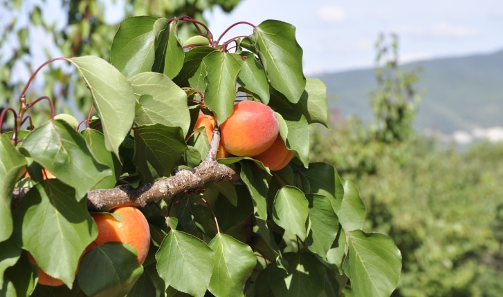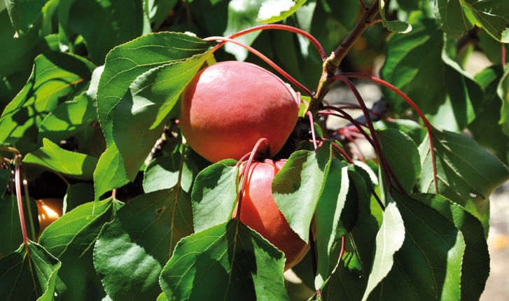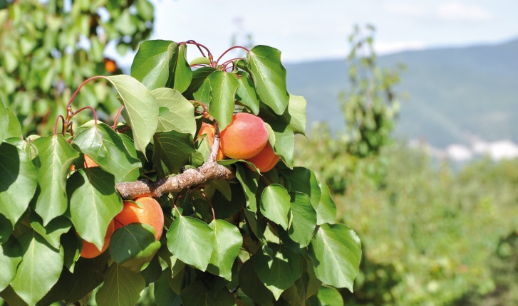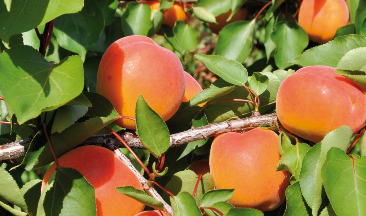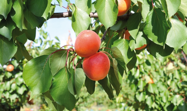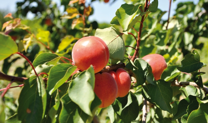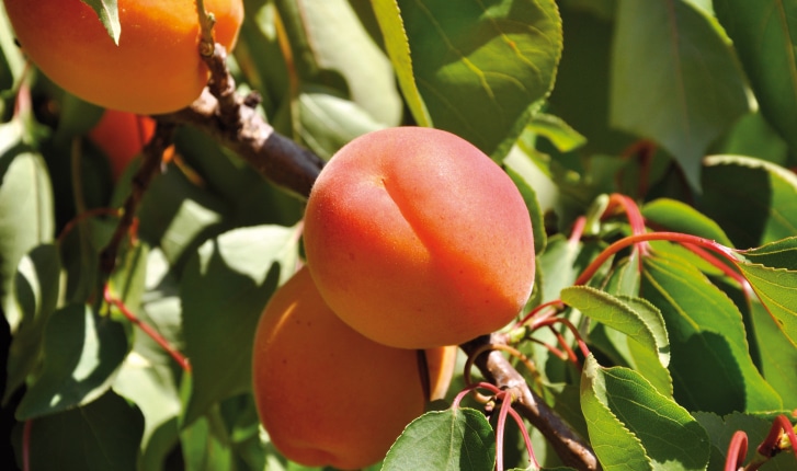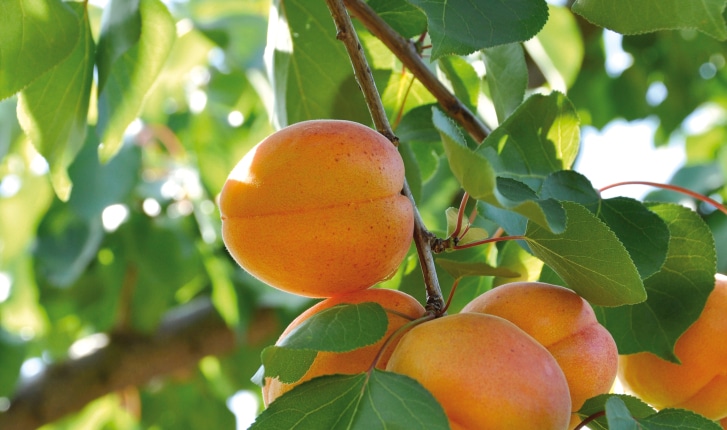 Verger d'abricotiers - production d'abricots - détail abricots sur une branche.