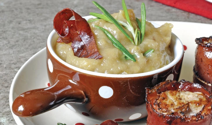 Une simple compote de pommes cuites au four et parfumée au romarin pour accompagner de petites pièces de veau enveloppées dans du speck puis dorées à la poêle.