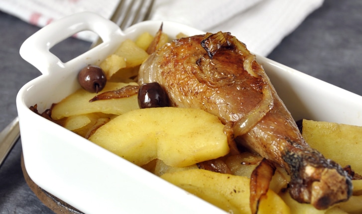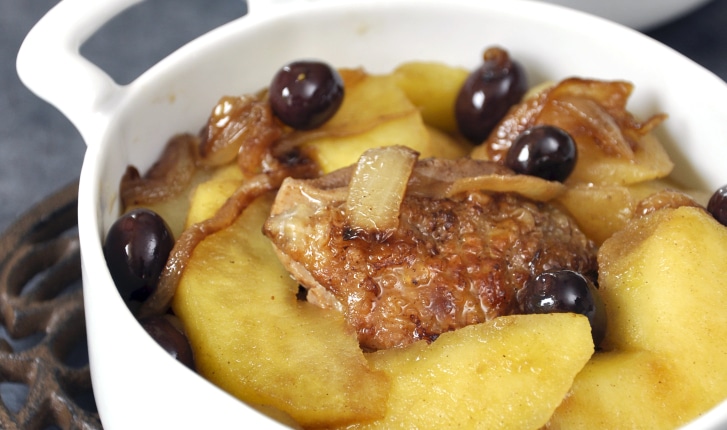 Une association de saveurs inattendue entre les pommes et les olives accompagne une pièce de pintade bien dorée.