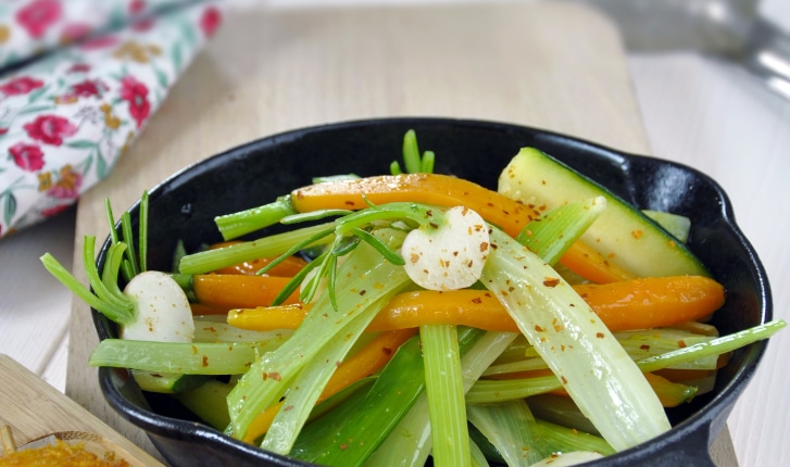 Toute la délicatesse des mini-légumes dans une poêlée express accompagnée de brochettes de crevette croustillantes.
