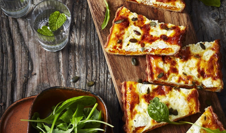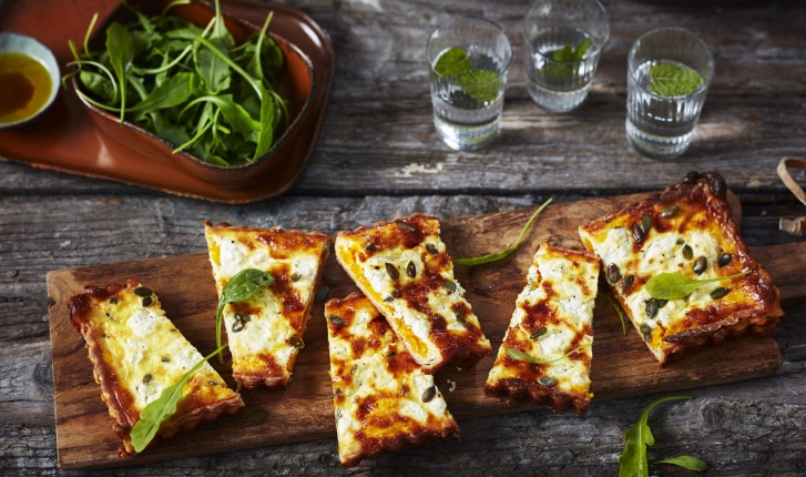 Tarte au potimarron et chèvre frais, pignons de pin