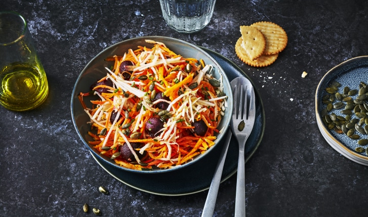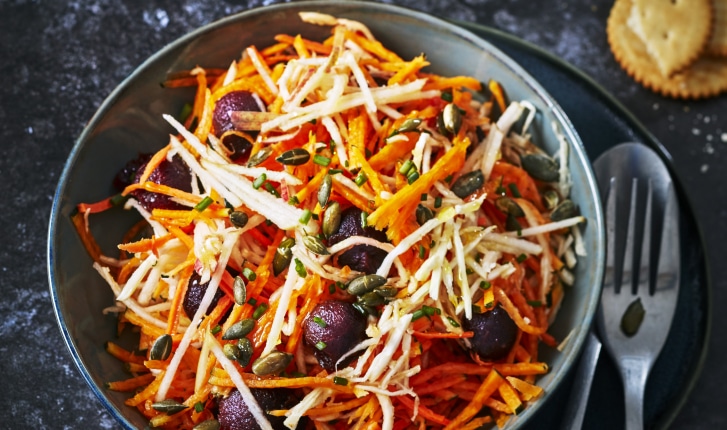 Salade croquante de buttercup, céleri rave, pomme, carotte et betterave