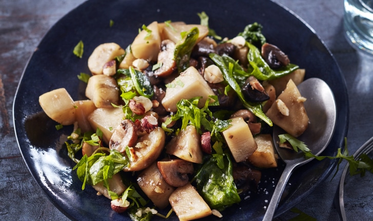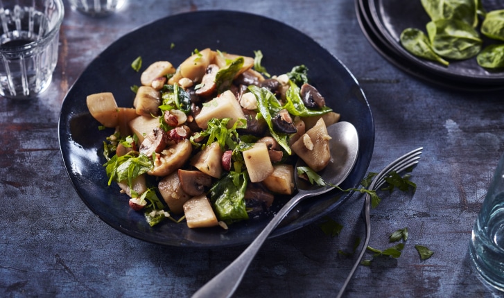 Poêlée de topinambours, champignons et épinard, noisettes