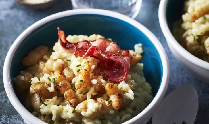 Risotto aux crosnes et chips de lard fumé