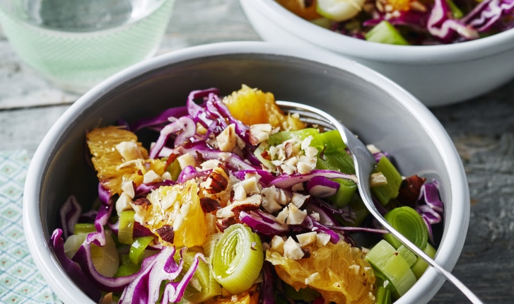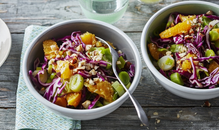 Salade de chou rouge, poireau, orange et noisettes