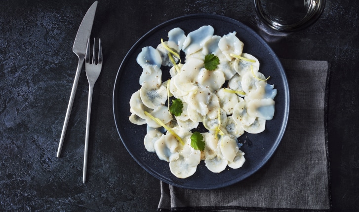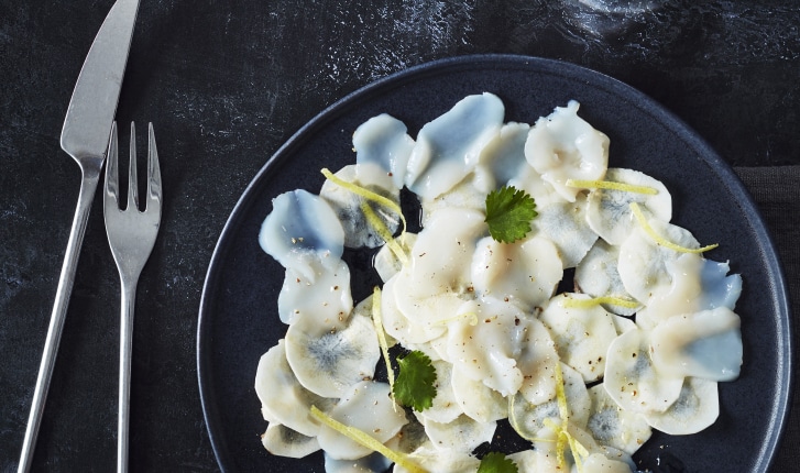 Carpaccio de cerfeuil tubéreux et noix de St Jacques à l’huile de noisette
