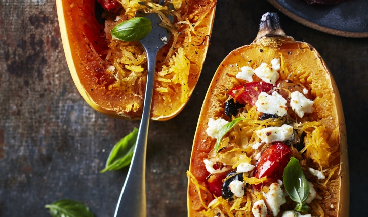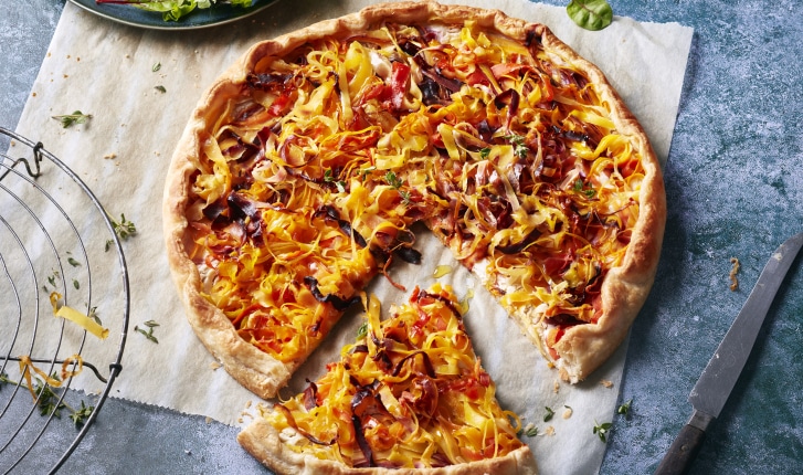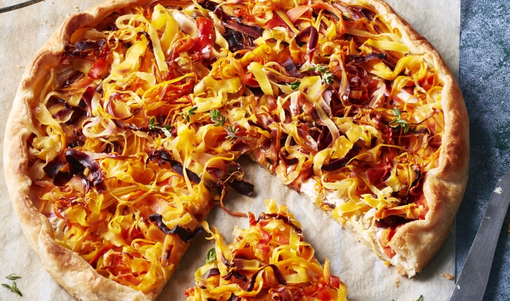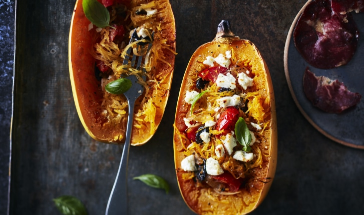 Courges spaghettis tomates oignons olives et coppa grillé, basilic