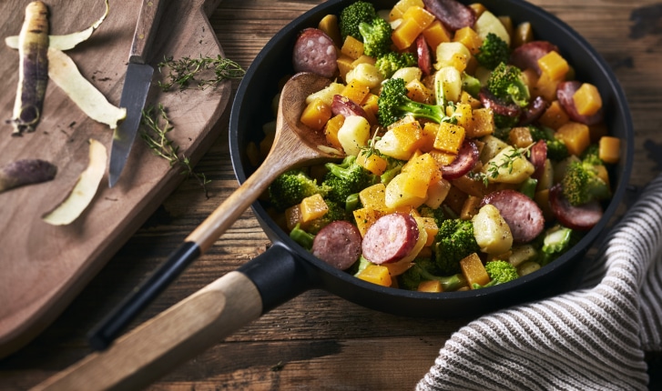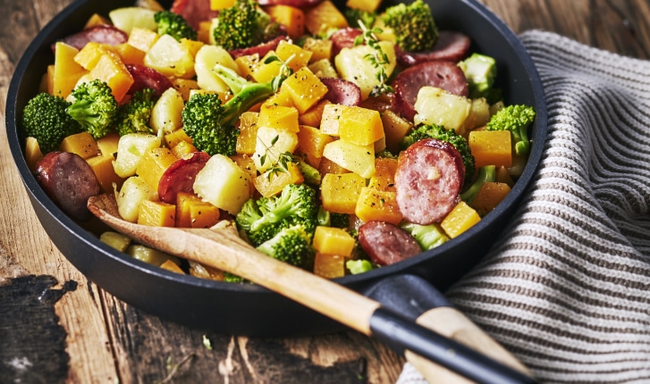 Poêlée de rutabaga, pommes de terre, brocoli et saucisse fumée