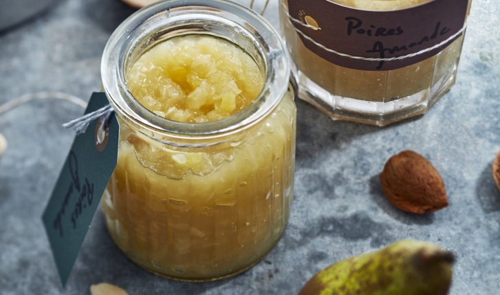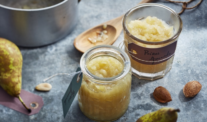Classique et délicieuse confiture de poire aux amandes entières émondées. Pour petit déjeuner chic, une confiture maison aux poires et amandes entières.