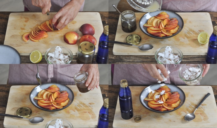 En deux temps trois mouvements, un petit dessert fruité à base de nectarines (abricot, melon, pêche, pomme, poire, prunes...selon le marché) parfumées au miel et à la fleur d'oranger.