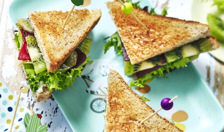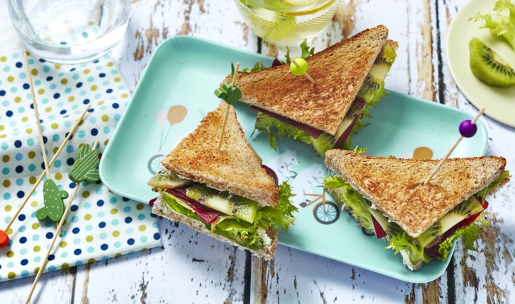 Toute la fraîcheur du kiwi et de la salade dans un petit sandwich croustillant. Par et pour les enfants, un sandwich club original kiwi-salade et fromage frais à réaliser en deux temps trois mouvements.