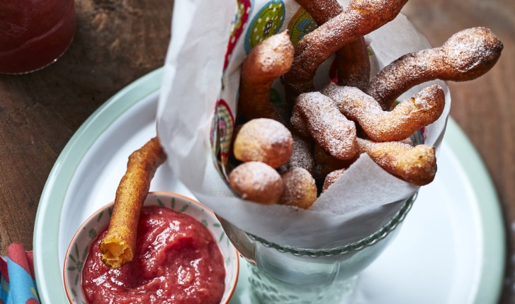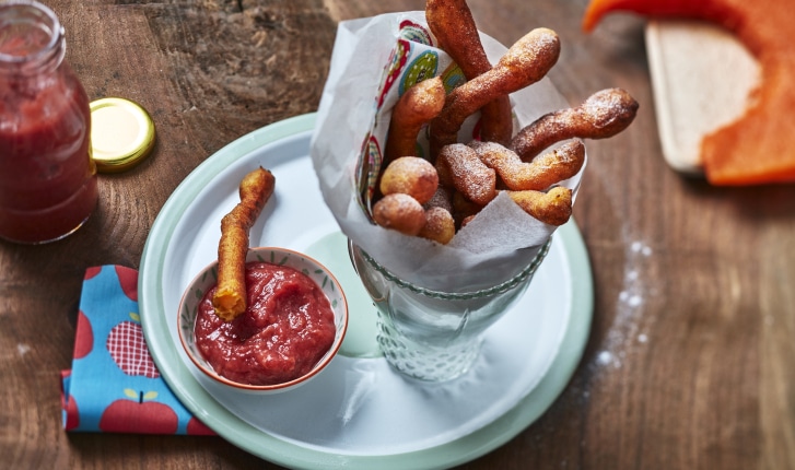 Craquants ces churros au potiron accompagnés d'un faux ketchup pomme-fraise. Frites et ketchup en trompe-l’œil : les churros dans le rôles des frites et la compote pomme-fraise dans le rôle du ketchup. Les enfants vont adorer !