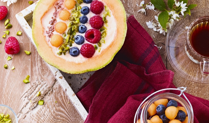 Pour bien commencer la journée, un smoothie de melon aux fruits rouges, haut en saveurs et en couleurs.