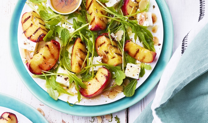 Ça sent bon l'été avec ces pêches grillées préparées en salade avec de la roquette, de la feta et de la menthe fraîche.