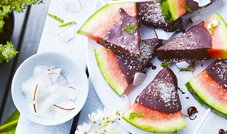 Rafraîchissants et gourmands ces triangles de pastèque enrobés de chocolat et poudrés de noix de coco râpé. Un délice !